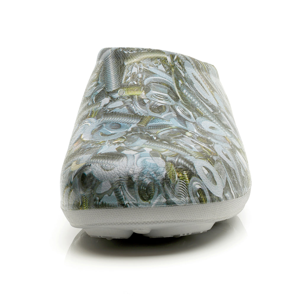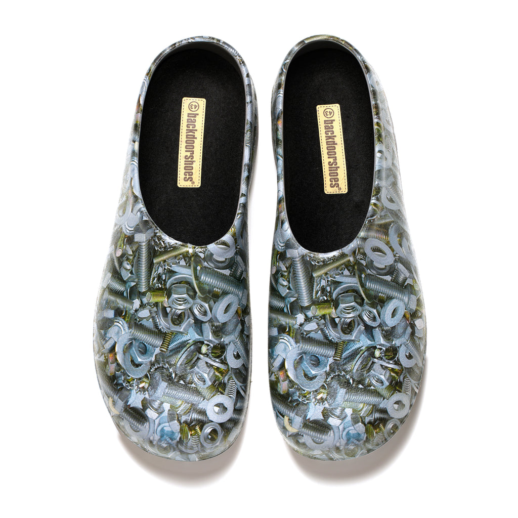 A visit to the son-in-law's shed, containing an old tin of nuts and bolts, was the inspiration for this design! These nut-themed clogs will definitely turn heads for all the right reasons!