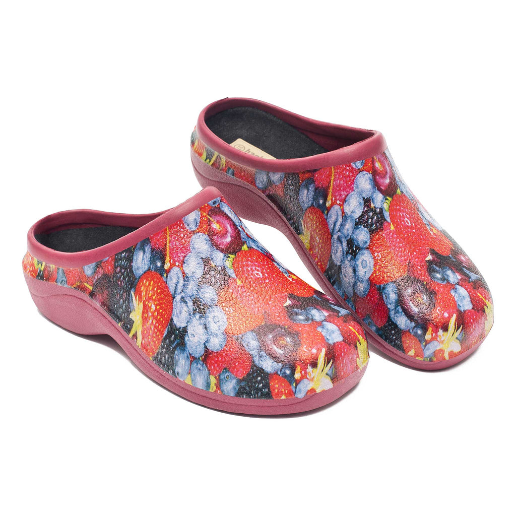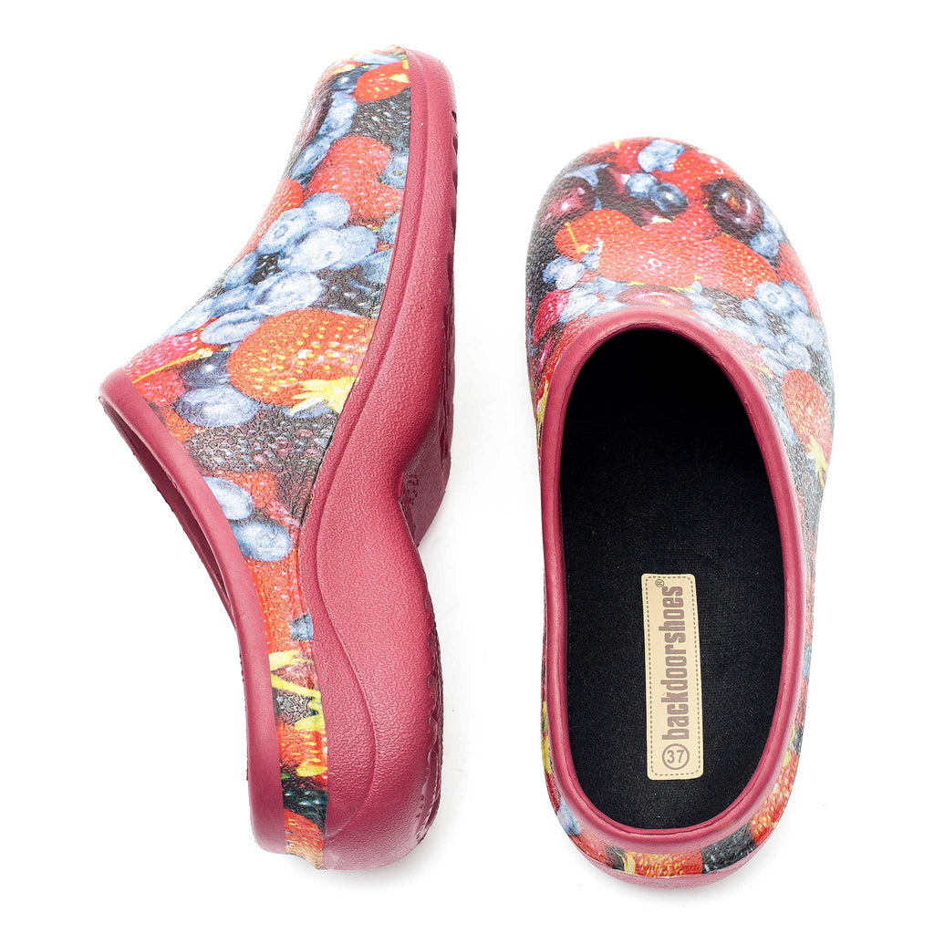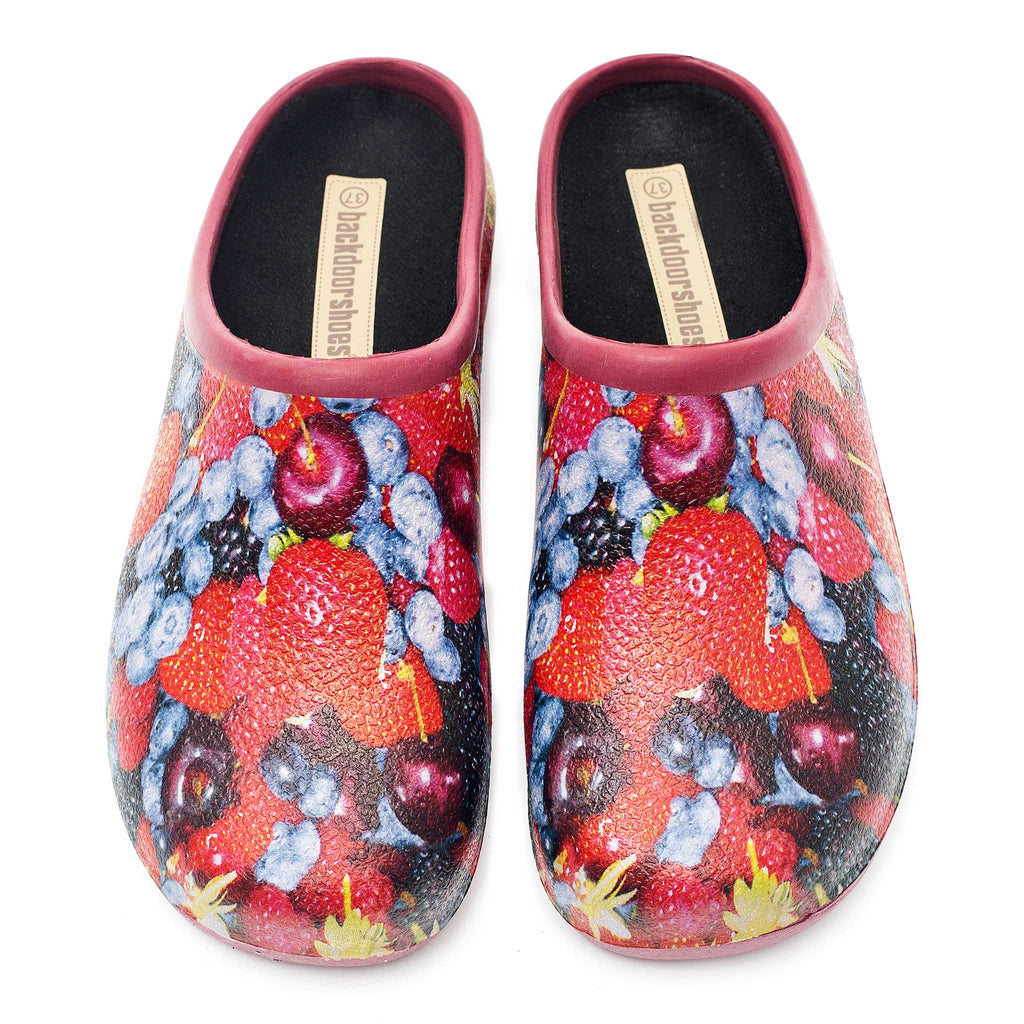 These glorious clogs, featuring a berry design with a raspberry-colored sole, were photographed at a local farm shop! Not only are they gorgeous clogs, but they are also a stylish and practical footwear solution—forget the days of wet feet or soggy slippers! These outdoor clogs are just for you!