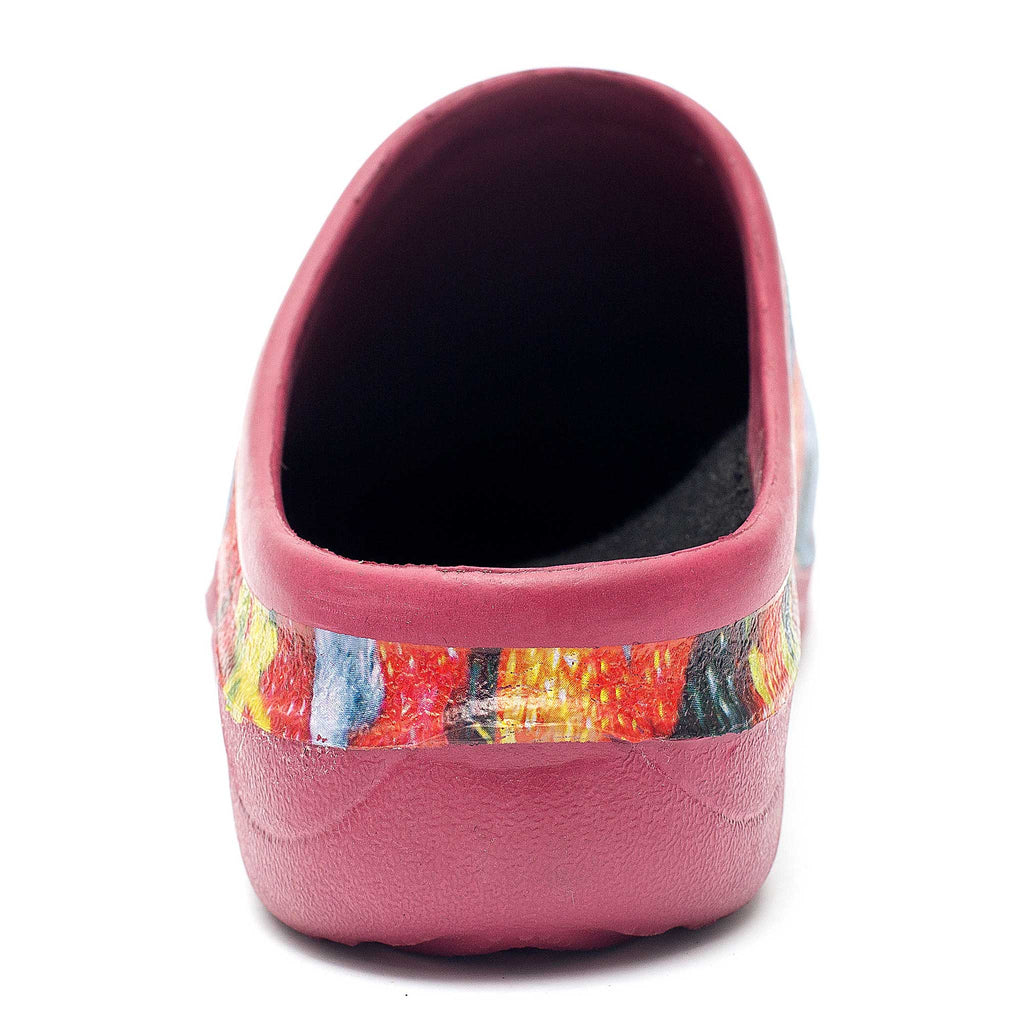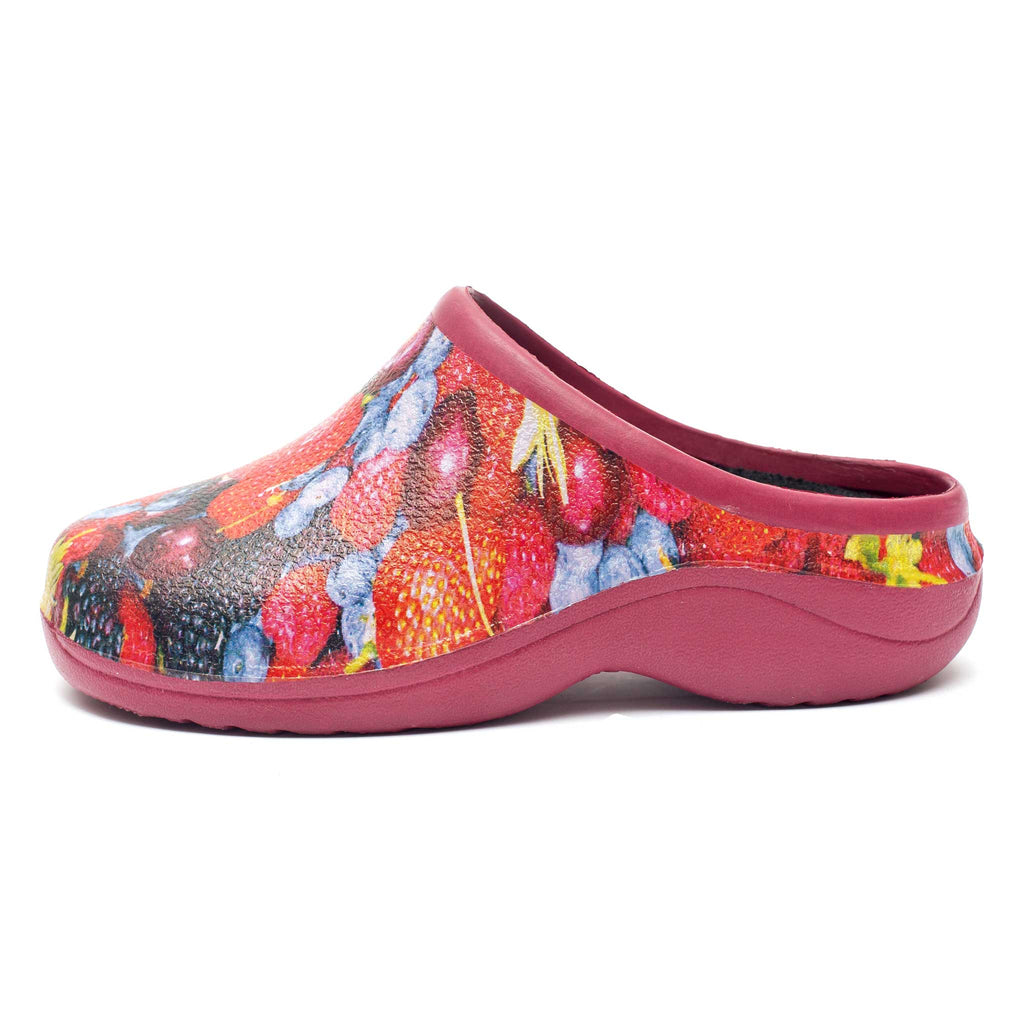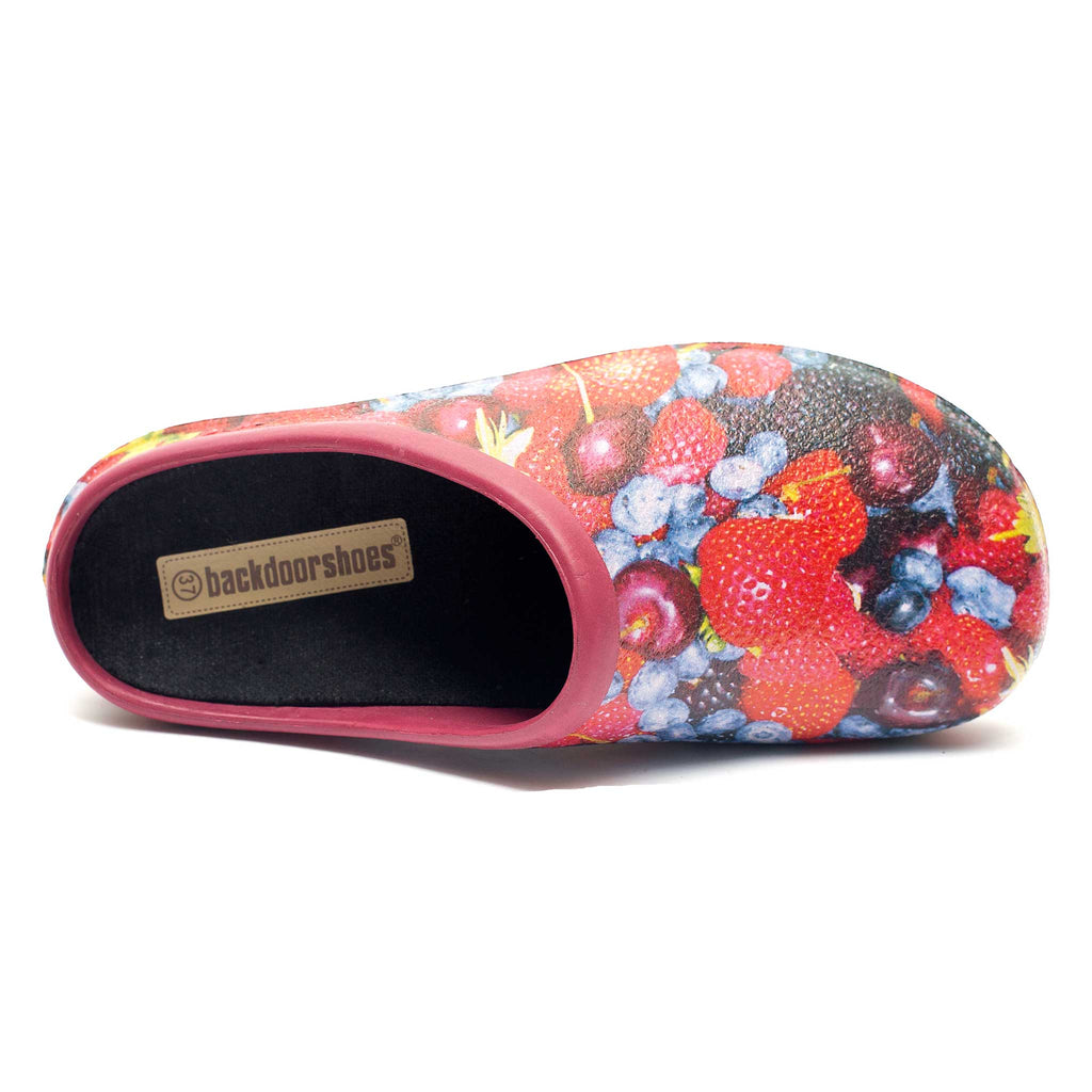 These glorious clogs, featuring a berry design with a raspberry-colored sole, were photographed at a local farm shop! Not only are they gorgeous clogs, but they are also a stylish and practical footwear solution—forget the days of wet feet or soggy slippers! These outdoor clogs are just for you!