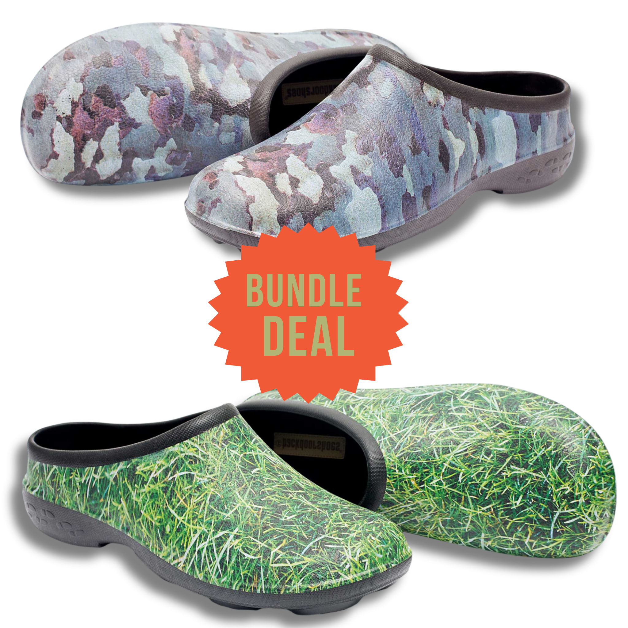 Step into comfort and style with our Backdoorshoes 2-Pair Clog Bundle. This duo brings together two of our most-loved designs—Blue Camo Originals and Grass Originals—so you can slip into whatever suits your day or your mood.